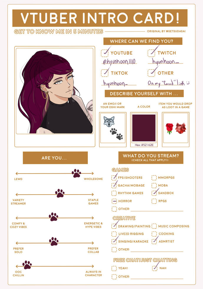 And that's the idea: Hyun is all I am not (or ever will be), but at the same time, we share some thoughts; maybe she is just a part that lives deep inside me.(You can follow her story by listening to my ASMRs on my Youtube channel.)At first, I was planning on naming her "Aki" and keeping an "Autunm" theme, but my inspiration hit me hard back then, and well, here she is, and I love her.Here's a little something about me:► I can't roleplay when streaming. My personality just would never allow it; I'm just too random.► I'm shy, but I push myself to not be (at least when the camera is on).► I have huge dreams and imagination; that's why I'm always daydreaming.► I can sing.► I speak Spanish (native language), English, and a little tiny itty bitty Japanese.► Mexican.►Catholic.► I'd love to work on a game or series as a voice actress at least once.► I want to be a full-time Vtuber. Right now I can't because #Work, but I'll do it someday. Just wait, please.► I tend to forget things easily (even words).► I tend to dissosiate :D► I love coffee.► MBTI: infp► I have made my character design from zero, rigged it, and worked on my own illustrations.